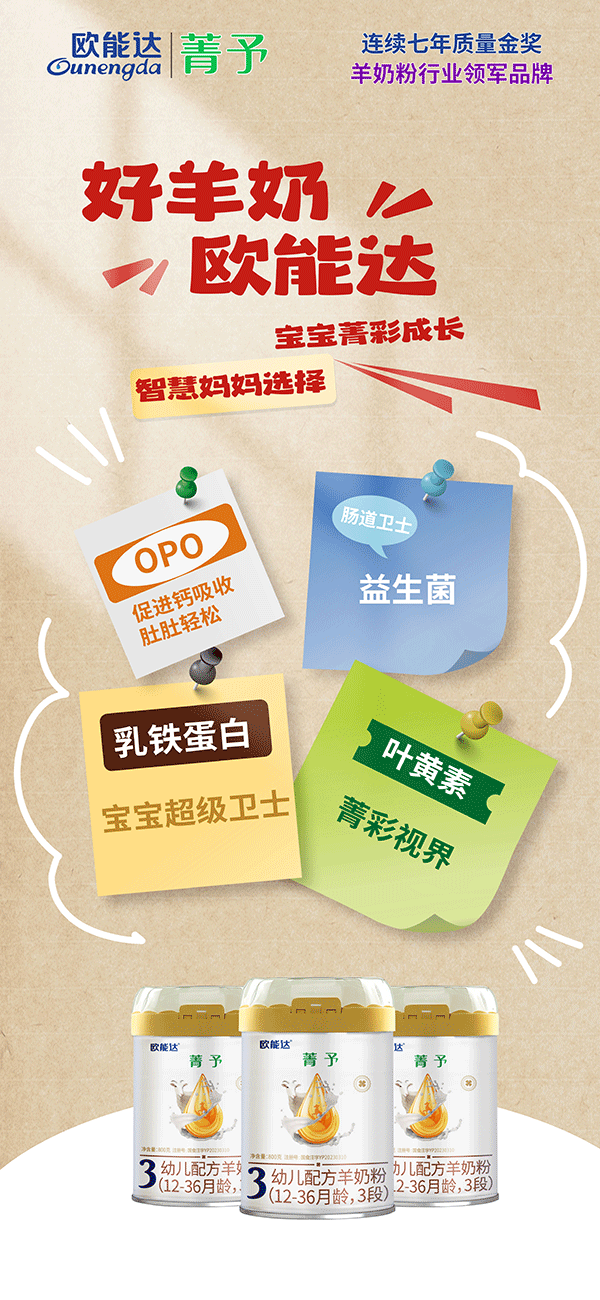 智慧媽媽選歐能達(dá)菁予羊奶粉? 連續(xù)七年質(zhì)量金獎,行業(yè)領(lǐng)軍?? 含 OPO 促鈣吸收、益生菌守護(hù)腸道、乳鐵蛋白增強防護(hù)、葉黃素助力視界?? 給寶寶 “菁” 彩成長,好羊奶就選歐能達(dá)~