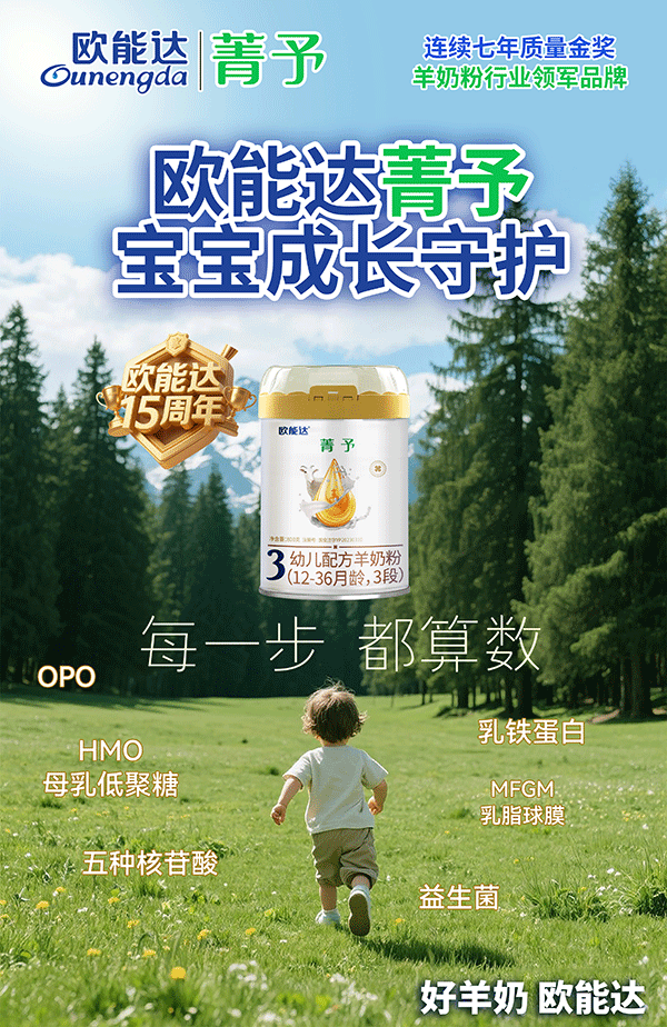 15 周年同行,歐能達菁予用滿滿營養(yǎng)(OPO、乳鐵蛋白等 ),守護寶寶成長每一步?? 連續(xù)七年質量金獎加持,好羊奶給成長穩(wěn)穩(wěn)底氣,讓小腳步邁得更有力量~