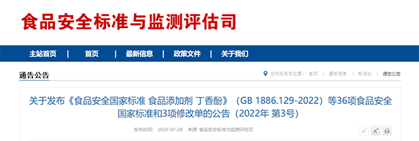 根據(jù)《中華人民共和國食品安全法》規(guī)定,經(jīng)食品安全國家標(biāo)準(zhǔn)審評(píng)委員會(huì)審查通過,現(xiàn)發(fā)布《食品安全國家標(biāo)準(zhǔn)?食品添加劑?丁香酚》(GB?1886.129-2022)等36項(xiàng)食品安全國家標(biāo)準(zhǔn)和3項(xiàng)修改單。其編號(hào)和名稱如下: