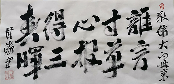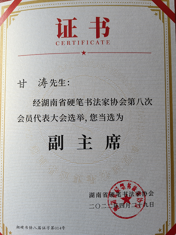 甘濤先生修習(xí)書(shū)法已達(dá)25年、功底深厚,有豐富的管理經(jīng)驗(yàn)和優(yōu)秀的組織能力,熱心公益,愛(ài)好學(xué)習(xí),受到書(shū)法界專(zhuān)業(yè)人士的高度認(rèn)可和贊揚(yáng)!